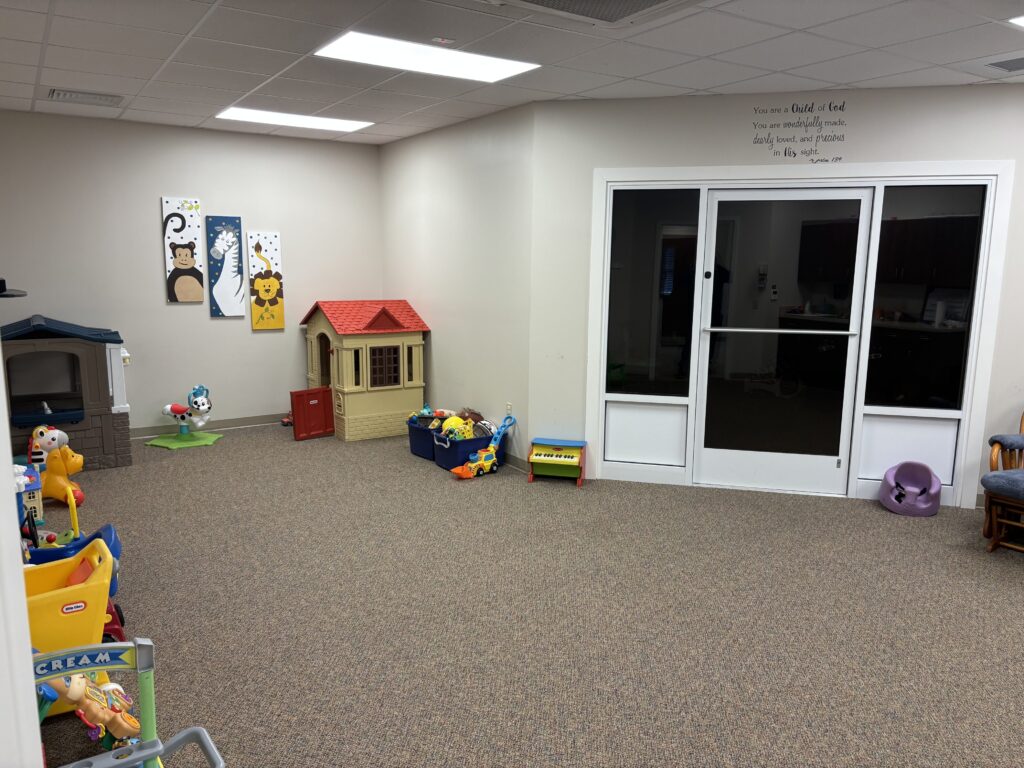 When you arrive, park in the parking lot by 6th avenue, across from city hall. Enter the door with the sign “Children’s Education Building”. Go down the first hallway on the right and take the first left to get to the children’s rooms. The nursery is the first classroom on the left.